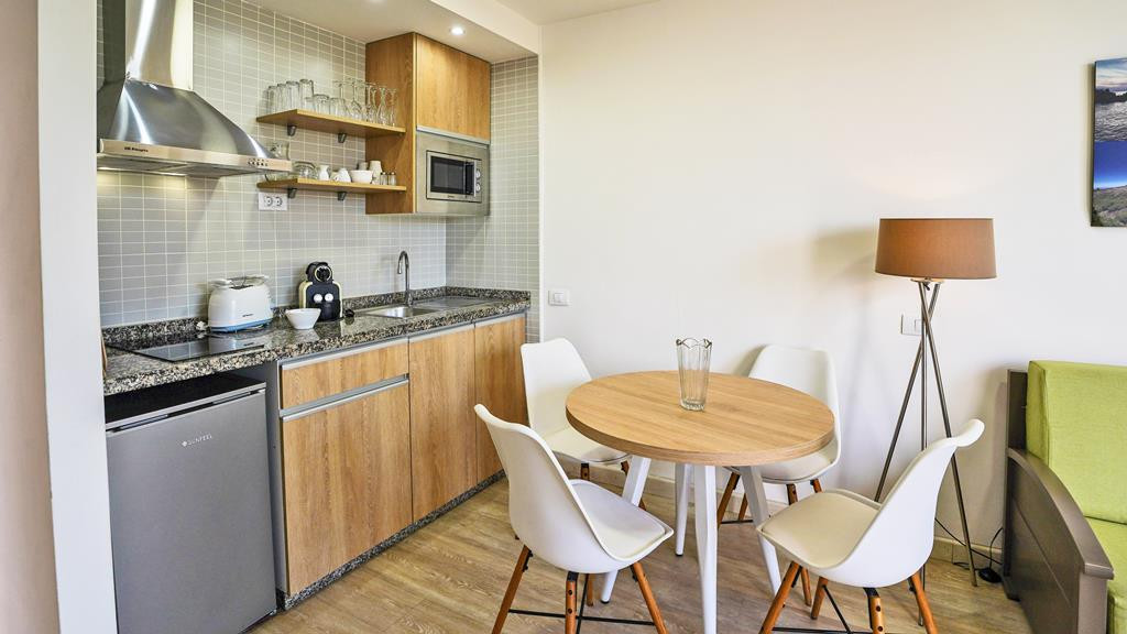 keuken met magnetron, inductiekookplaat (2 zones), koelkast, broodrooster, Nespresso apparaat, waterkoker en eethoek
